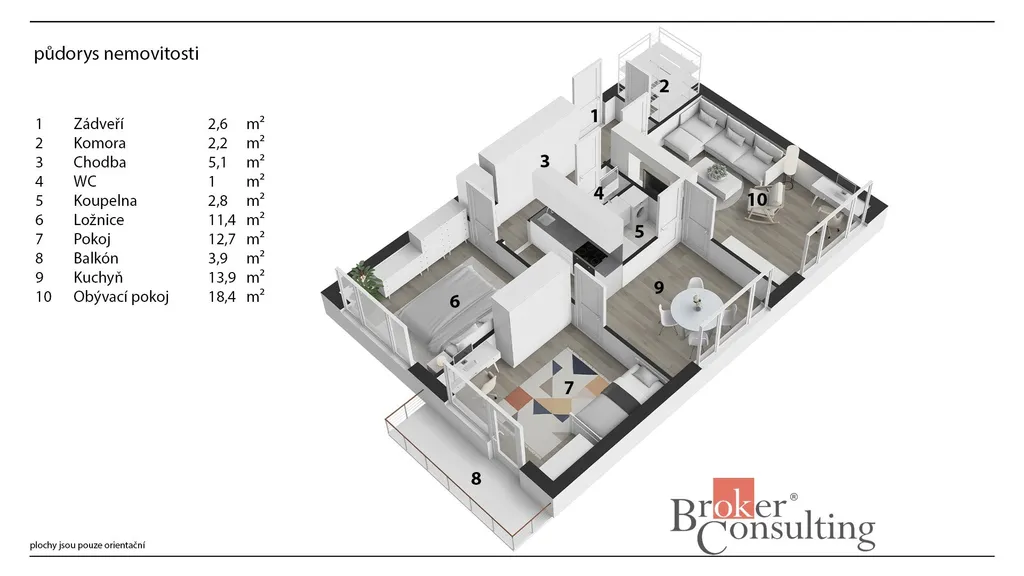 Dispozice je navržena s důrazem na komfort každodenního bydlení – vstupní chodba se šatnou, samostatná ložnice, další pokoj ideální jako pracovna či dětský pokoj a prostorný obývací prostor s kuchyní a jídelní částí. Nechybí ani koupelna a samostatné WC. Celek působí velmi funkčně a zároveň příjemně otevřeně. Příjemným benefitem je balkon o velikosti 3,60 m², který nabízí prostor pro ranní kávu i večerní odpočinek, a sklepní kóje o velikosti 0,80 m² pro praktické uložení věcí.
