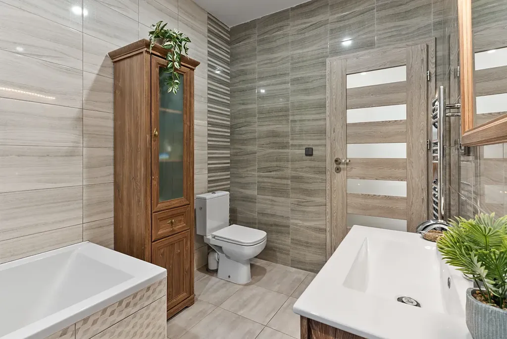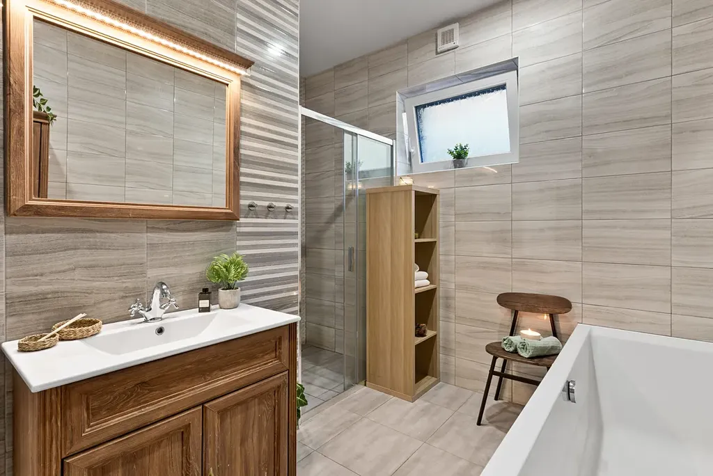• prostornou koupelnu kombinující moderní design a funkčnost - elegantní vana + stylový sprchový kout,