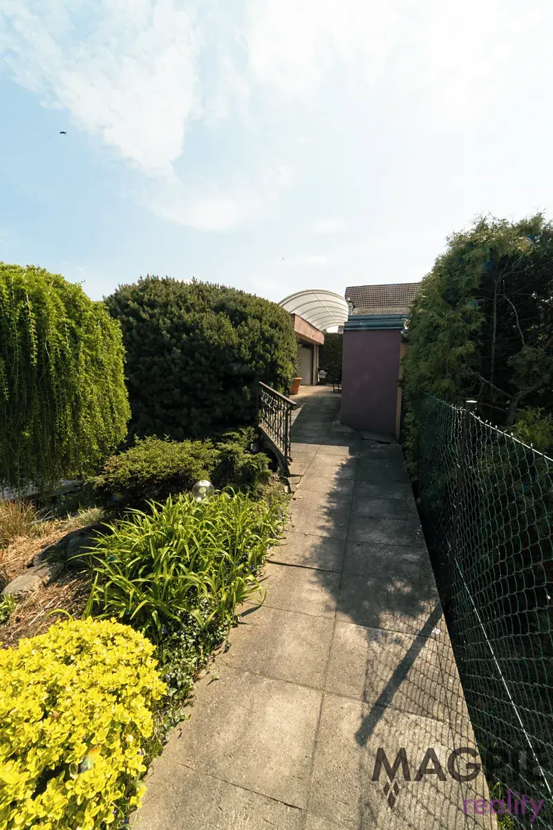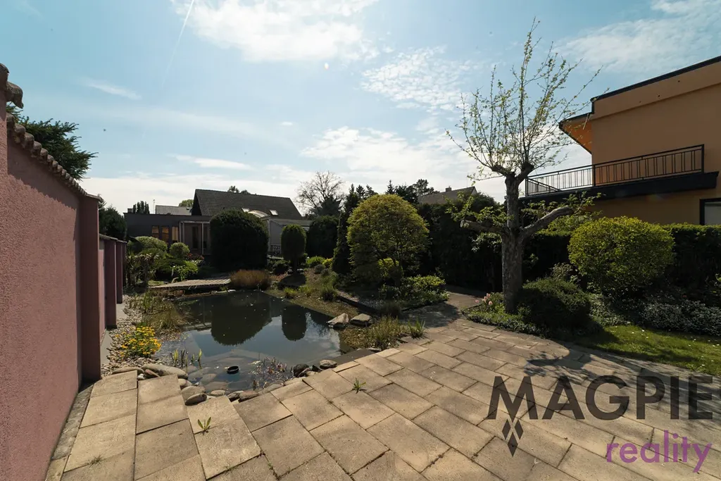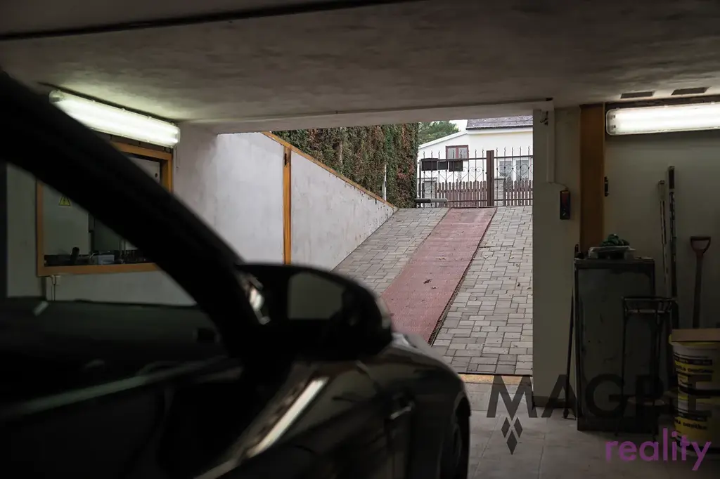 K domu patří udržovaná zahrada s biotopem o rozloze 290 m² a menší předzahrádka. Významným benefitem je mimořádné parkovací zázemí – dvoupodlažní garáž o rozloze 87 m², která díky hydraulické rampě umožňuje parkování čtyř vozů přímo v garáži. Další zastřešené stání a možnost parkování vozu na pozemku zajišťují celkovou kapacitu až pěti automobilů.