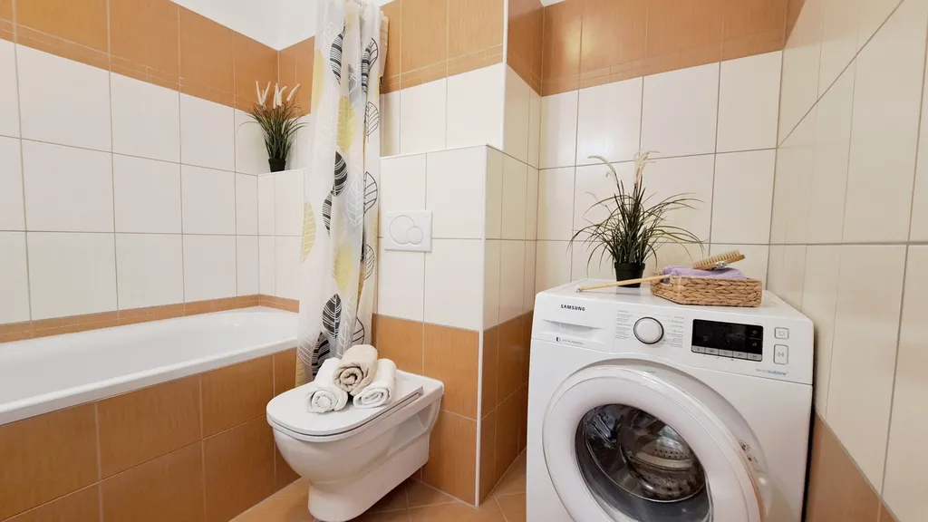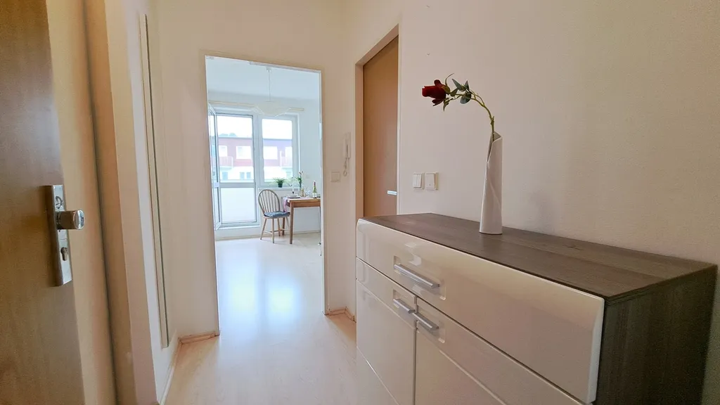 Dispozice tvoří obytný prostor spojený s kuchyní, předsíň s vestavěnou skříní a koupelna s vanou a WC. Byt má vlastní topení, což dává nájemci kontrolu nad náklady i komfortem.