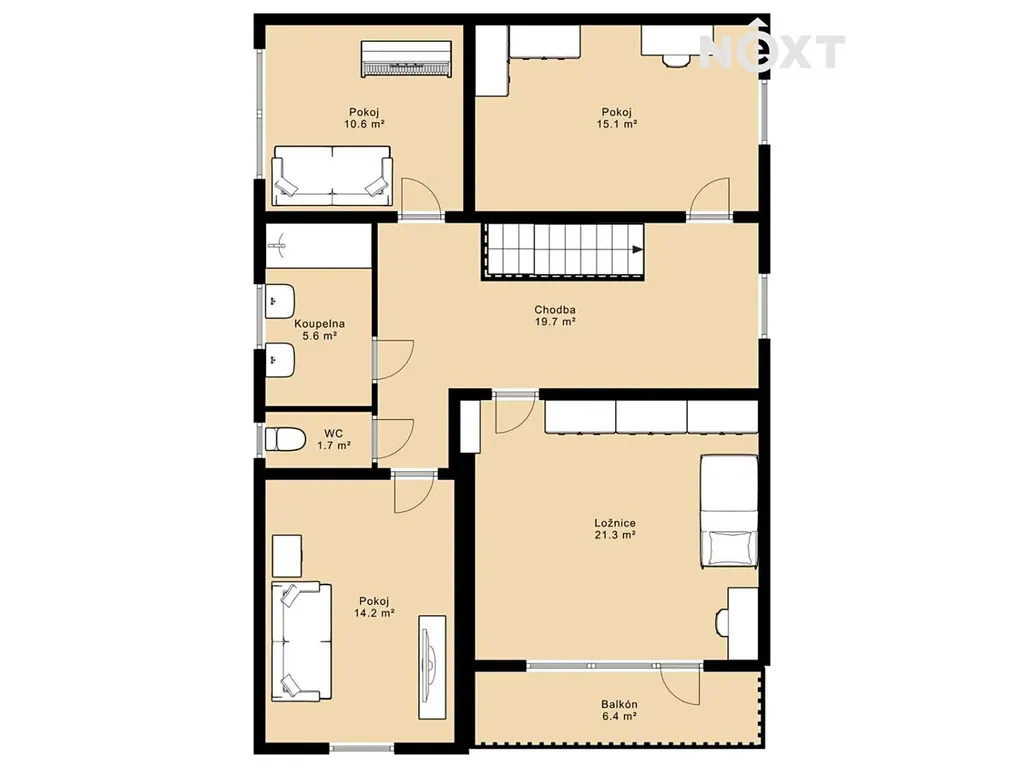 V horním patře se nachází ložnice a další obytné místnosti. Celková dispozice domu nabízí dvě koupelny a díky svému řešení umožňuje i rozdělení na dvě samostatné bytové jednotky. V patře je navíc připravena instalace pro kuchyň a každé podlaží má vlastní jističe, což tuto variantu ještě více podporuje.