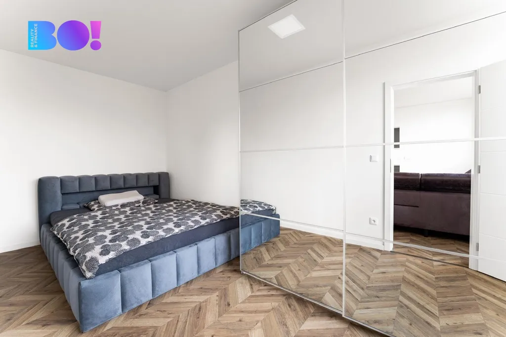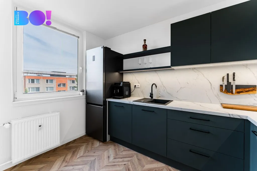 Byt tvoří prostorný průchozí obývací pokoj, který nabízí dostatek místa pro odpočinek i společné chvíle, a samostatná ložnice s velkou šatní skříní. Kuchyně je samostatná, moderně řešená a vybavená vestavnou troubou, sklokeramickou varnou deskou, mikrovlnnou troubou, myčkou a lednicí.