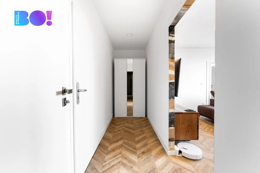 Vstupní chodba poskytuje praktické úložné prostory v podobě vestavěné skříně. Koupelna je vybavena sprchovým koutem, toaletou, topným žebříkem a úložnými skříňkami, včetně výsuvné skříňky pod umyvadlem. Součástí bytu je postel, pračka a sušička (sedací souprava není součástí prodeje).