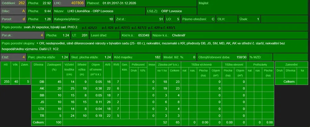 - p.č. 426 vedená jako lesní pozemek o celkové výměře 5 665 m2 (stáří lesa 49 let - zastoupení dřevin dub, akát, javor, jasan, třešeň ptačí),