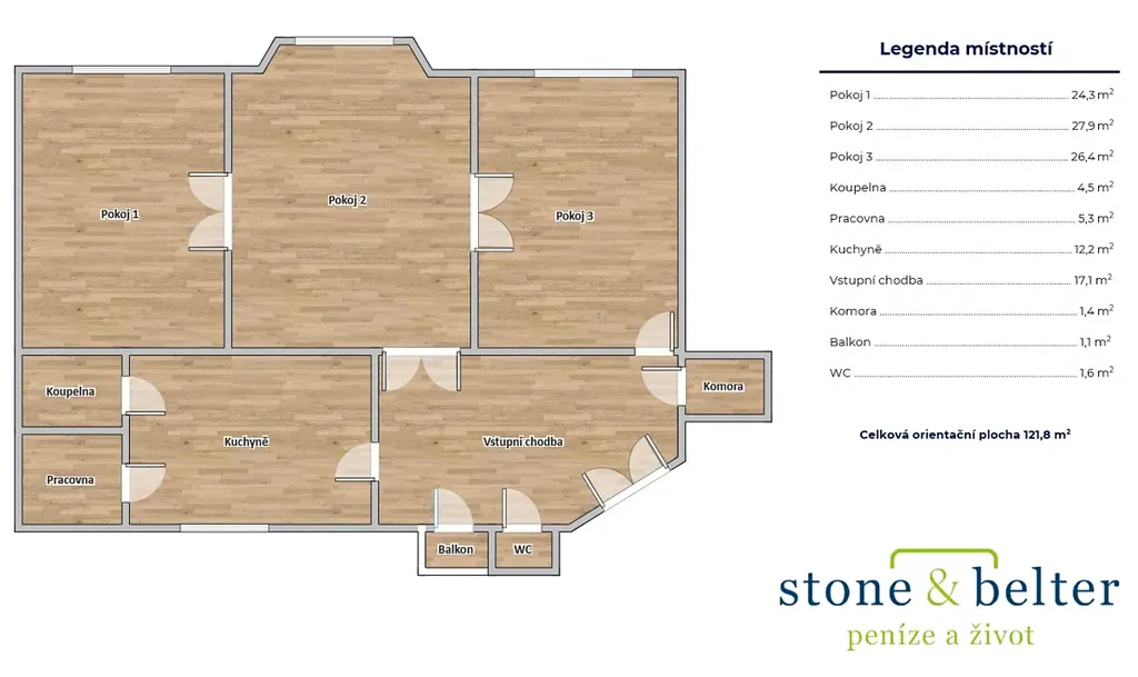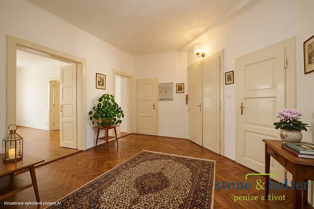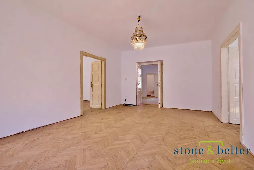 Prostorný byt o velikosti 123 m² se nachází ve 4. nadzemním podlaží prvorepublikové budovy a nabízí 3 velkorysé pokoje (26,6 m², 28 m² a 24,5 m²; vstup do prostředního pokoje je též z vedlejších pokojů), samostatnou kuchyni (12,3 m²), menší pracovnu (5,4 m²) a komoru (1,5 m²), koupelnu (4,7 m²), toaletu (1,7 m²) a balkon s výhledem do vnitrobloku (1,4 m²).