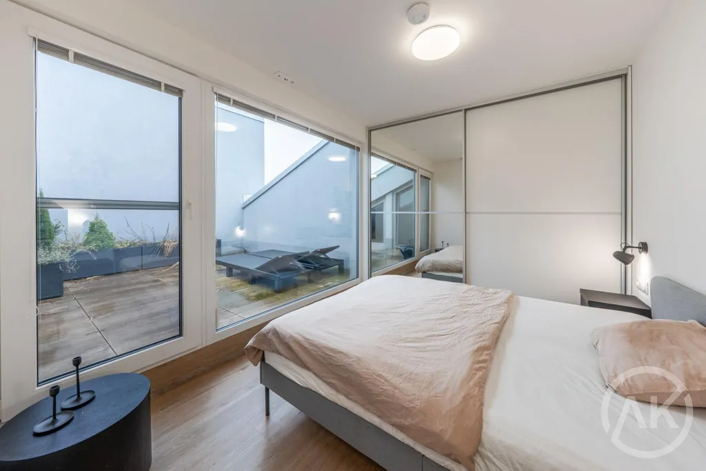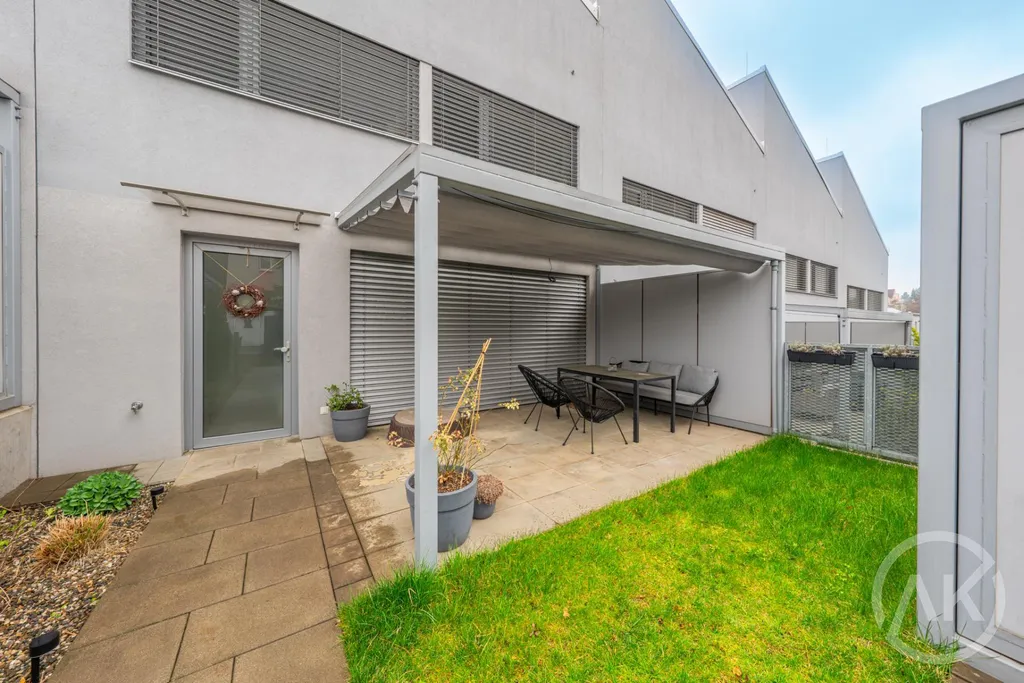 Dům je vhodný zejména pro ty, kteří se nechtějí trápit s hromadou práce kolem domu, ale rádi si užijí všechny jeho výhody. Není tady skoro žádná zahrada, ale jsou tady tři boží terasy: severní za domem pro milovníky stínu, jižní před domem pro milovníky slunce, jako jsem třeba já a východní u ložnice, protože vstávat se sluncem je prostě nejvíc. Zahradní vybavení pohodlně schováte ve skladu před domem. Parkovací stání tady máte dvě a v případě potřeby ještě třetí na chodníku.