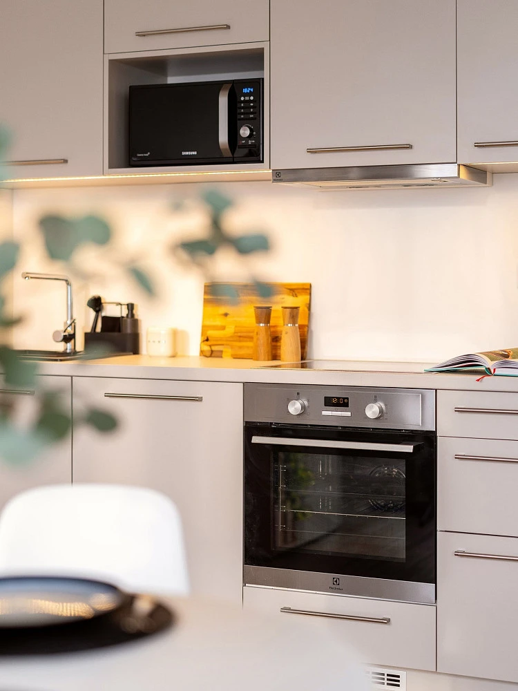 Byt je vybavený kuchyňskou linkou včetně všech potřebných spotřebičů. Jeho součástí je prostorná koupelna se sprchovým koutem a parní pračkou. Samozřejmostí je také vybavenost veškerým nábytkem. Těšit se můžete na postel s pohodlnou kvalitní matrací (dvě možná uspořádání – dvoulůžko nebo dvě oddělené postele pro spolubydlení). Dále je v bytě k dispozici televizor, dostatek promyšlených úložných prostor. Bonusem bude příjemné posezení na prosluněném balkonu.