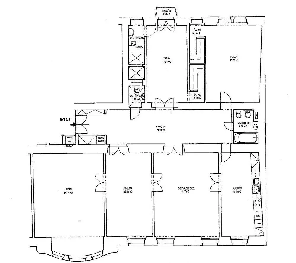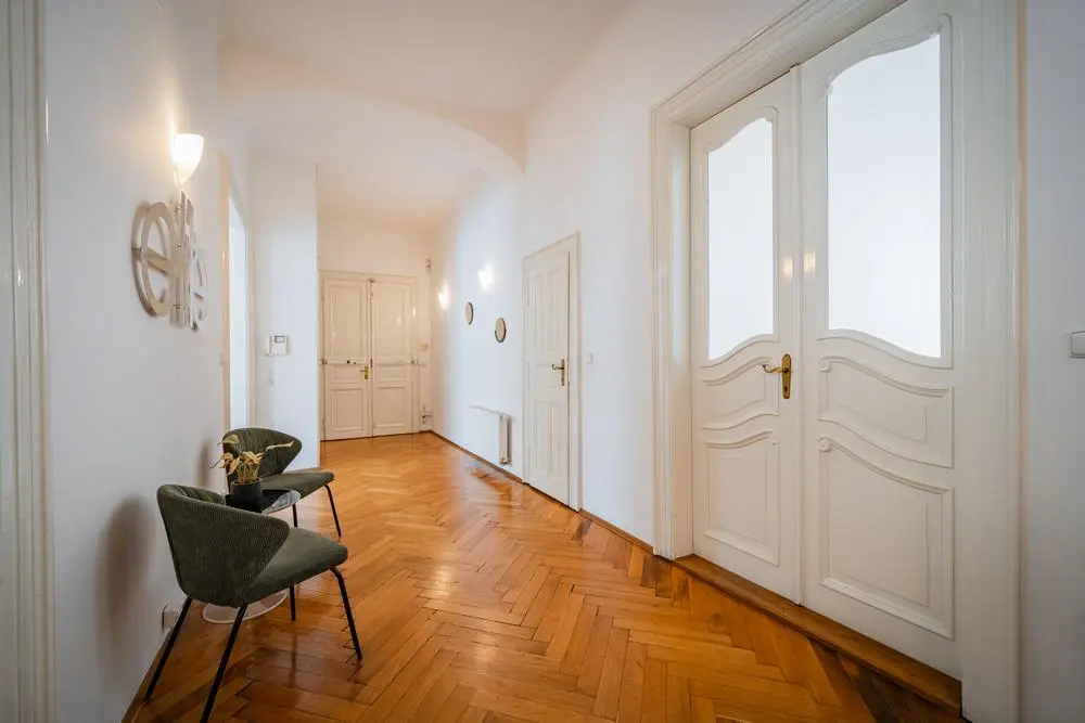 Byt je situován ve 3.patře renovovaného secesního domu s výtahem. Celková plocha bytu činí 197 m2, je vybaven kuch. linkou se zabudovanými spotřebiči, 2x koupelnou, 3x WC. Vytápění je samostatným plynovým kotlem. V bytě jsou masivní parkety, zdobené štukové stropy, dvoukřídlé dveře.