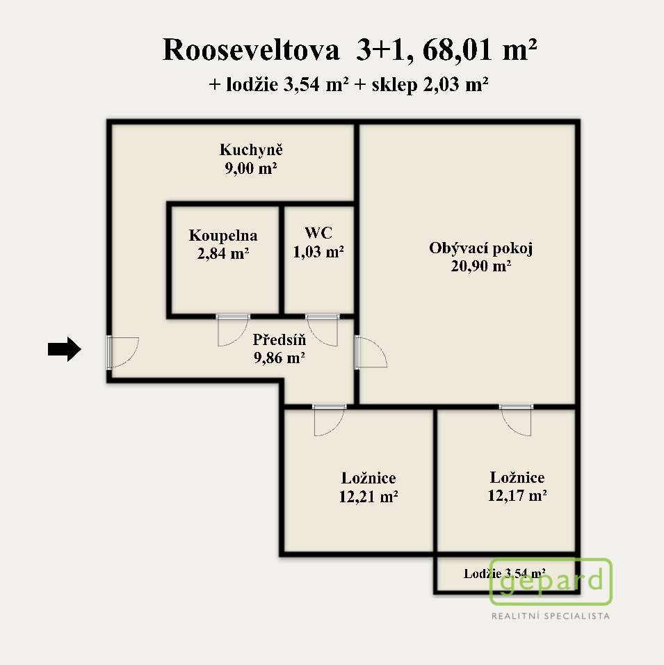 K bytu náleží lodžie o velikosti cca 3,54 m² se vstupem přímo z ložnice a sklepní kóje o výměře cca 2,03 m².