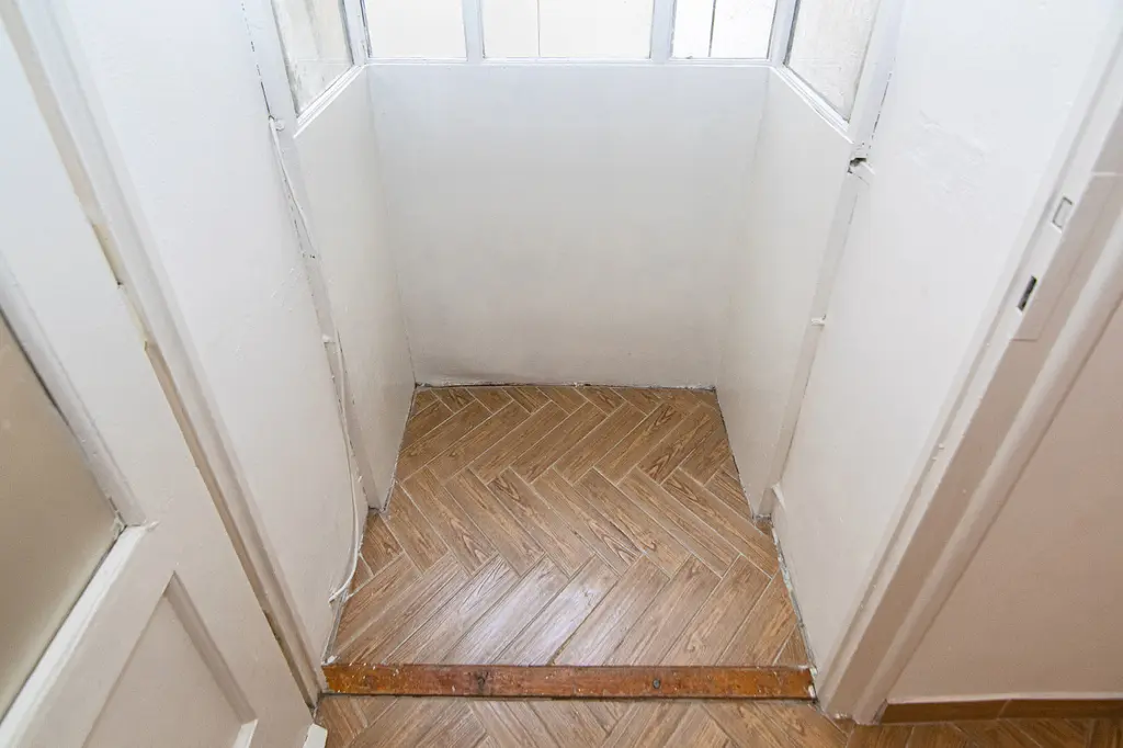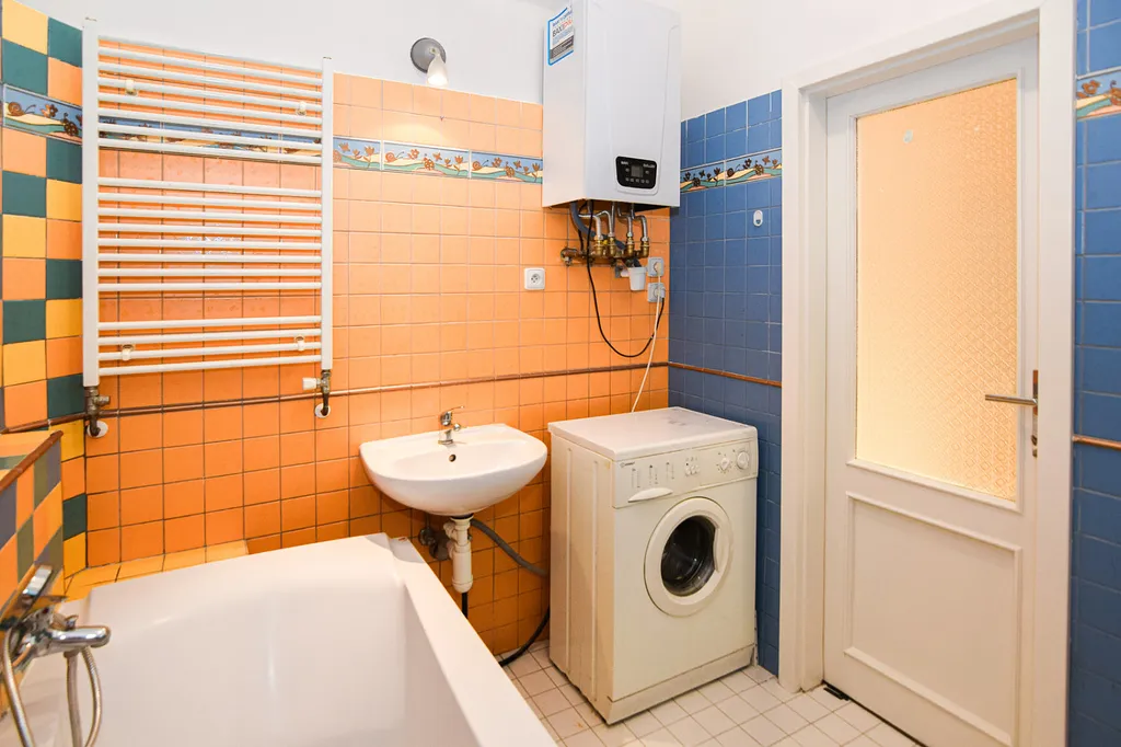 Koupelna je společná s toaletou. Je zde vana, umyvadlo a dostatek místa pro pračku.