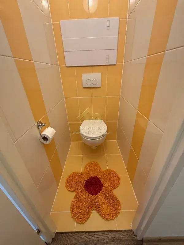 Vstupem do bytu vejdeme do prostorné chodby do tvaru „L“, napravo se nachází zděné jádro se samostatnou koupelnou, kde je osazen sprchový kout, umyvadlo a k dispozici je i pračka. Dále je zde samostatné WC.