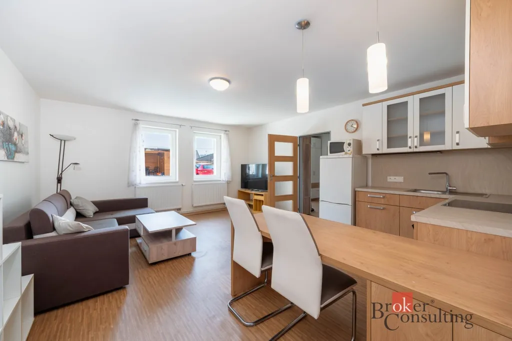 Dispozice bytu tvoří obývací pokoj s kuchyňským koutem, samostatný pokoj, koupelna se sprchovým koutem a toaletou. Součástí bytu je základní vybavení (viz foto), které je možné po domluvě ponechat nebo odstranit.