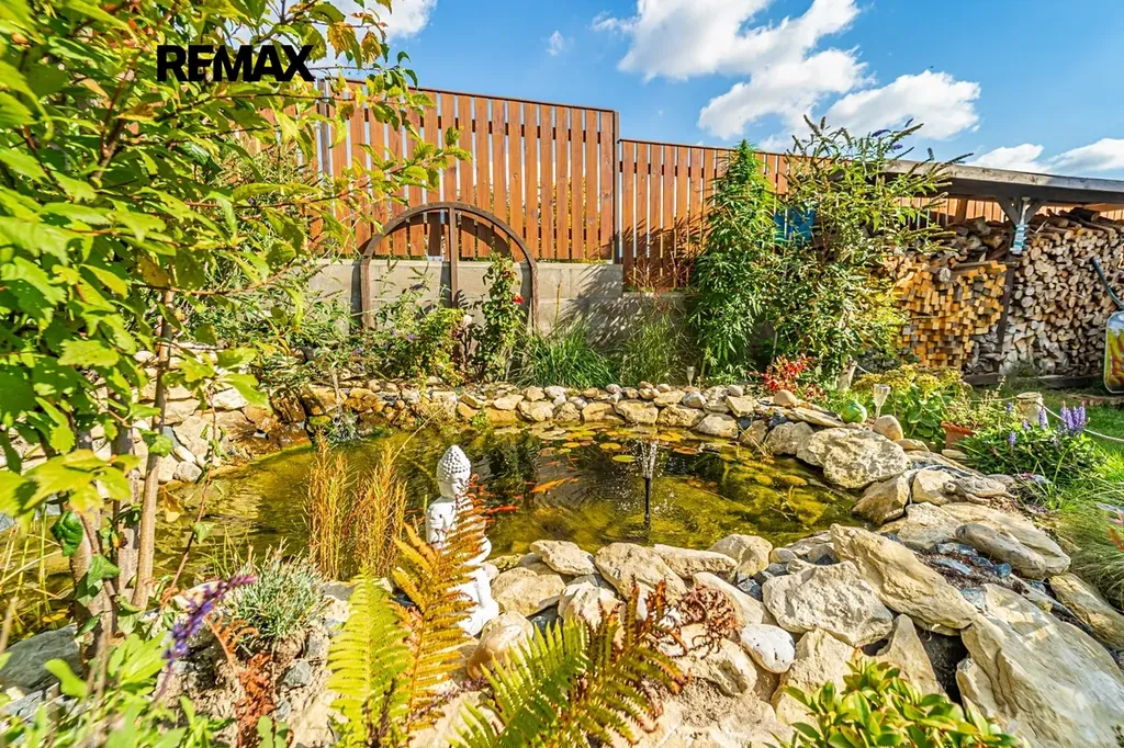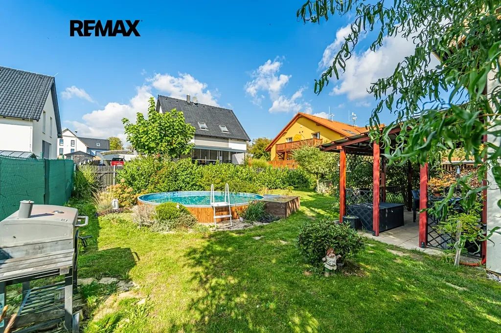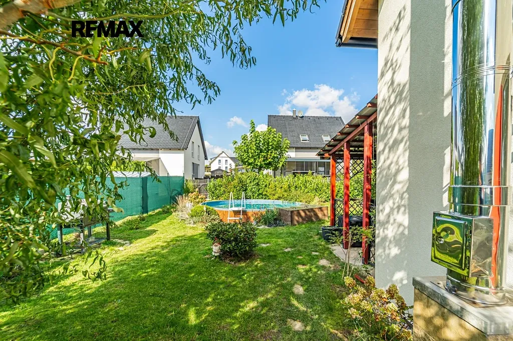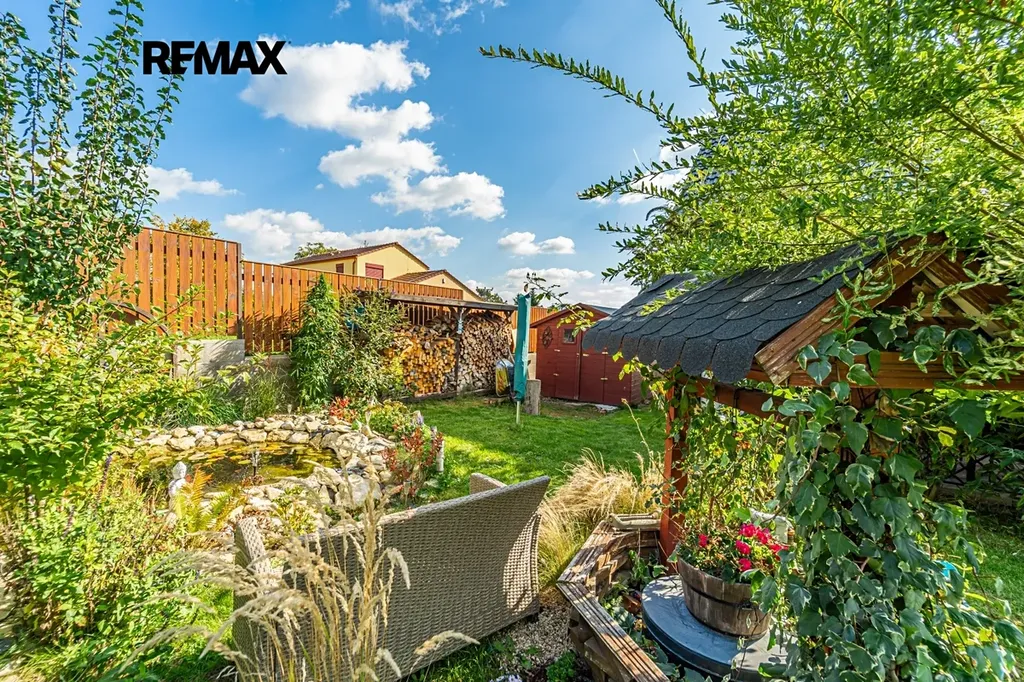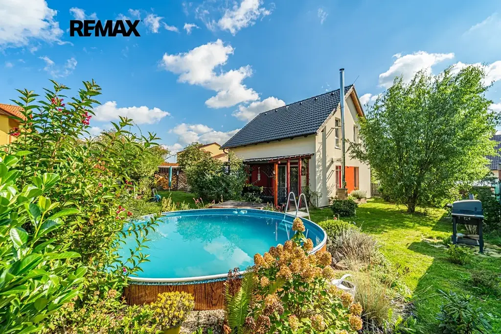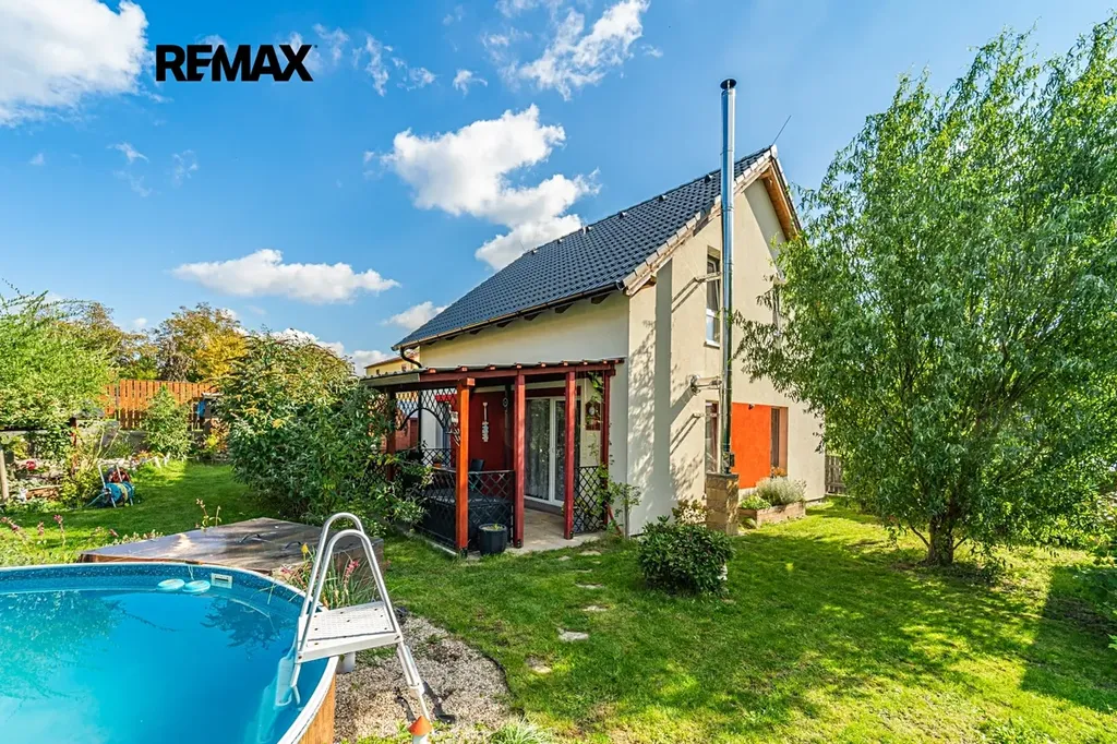 Nemovitost sestává z rodinného domu o dispozici 4+kk (96 m2) , samostatně stojící garáže s montážní jámou (20 m2), zastřešené terasy (15 m2), přírodního jezírka, zahradního domku a polozapuštěného venkovního bazénu. Bazén i jezírko disponují čistícím a filtračním zařízením. Na první pohled Vás osloví pečlivě udržovaná zahrada kolem domu, citlivě kombinující okrasné a užitkové prvky.