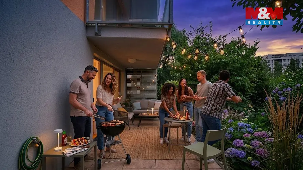 K bytu náleží sklep o velikosti 2 m², venkovní parkovací stání a přístup na soukromé dětské hřiště. Byt je v těsné blízkosti parku Zahrádky s možností relaxace i aktivního pohybu v přírodě. V okolí je veškerá občanská vybavenost a Galerie Harfa. Výborná dostupnost do centra města – tramvajová zastávka U Elektry.