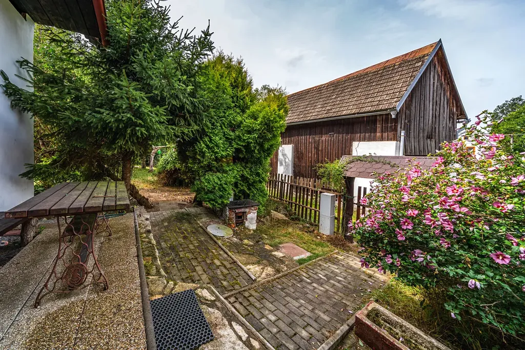 Budova na pozemku o celkové rozloze 689 m2 napojeným na obecní cestu díky které lze zastavit přímo u domu. Dispozice domu je 4+1 o celkové podlahové ploše 125 m2 s možností využití půdního prostoru. Součástí domu je i malý sklípek s možností přístupu z budovy nebo zvenčí. Na pozemku se dále nachází venkovní posezení, dětské pískoviště a improvizovaně zastřešený bazén. Předmětem prodeje je i 60 m2 stodola stojící na dalším pozemku o rozloze 143 m2, která lze využít jako dvougaráž s přímým vjezdem z příjezdové cesty.