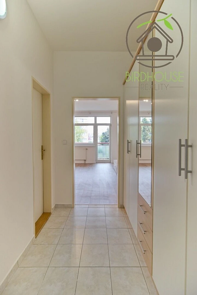 Dominantou bytu je prostorný obývací pokoj s novou vinylovou podlahou a moderní kuchyňskou linkou. Ta je navržena s důrazem na velkorysý úložný prostor a je osazena novými spotřebiči jako je indukční varná deska, horkovzdušná trouba a lednice. Z pokoje je přístup na balkon s příjemným výhledem do zeleně.