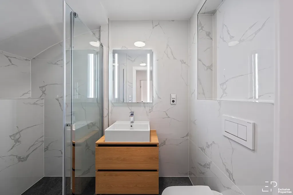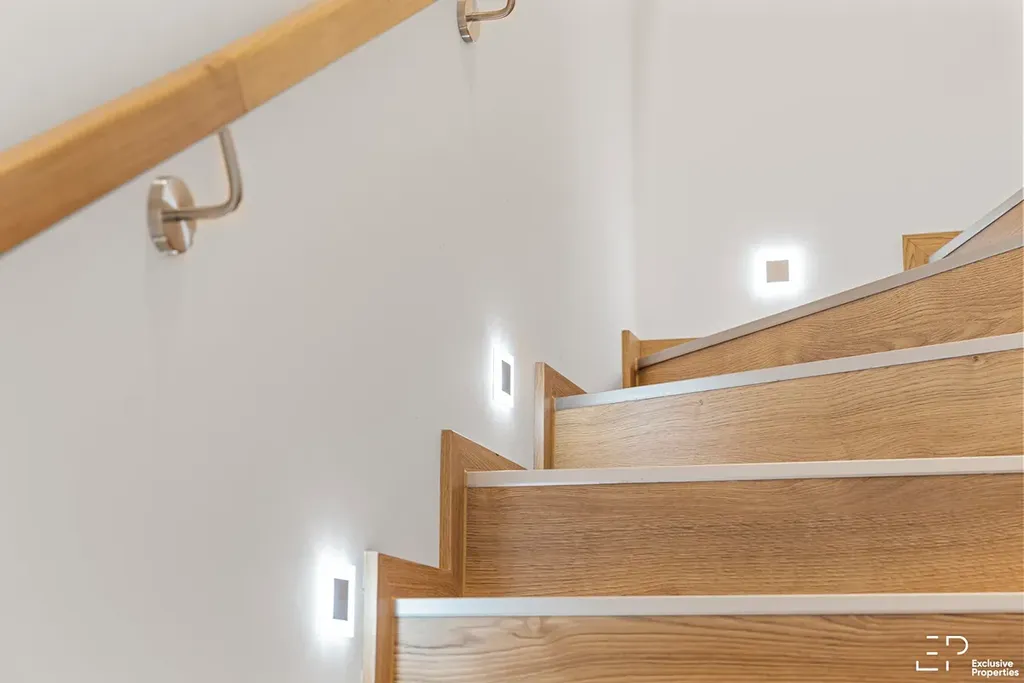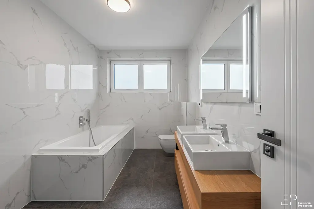 V patře jsou umístěny tři ložnice, z toho hlavní ložnice má vlastní koupelnu se sprchou. K dispozici je také druhá koupelna s vanou, WC, 2 umyvadla. Celkem tedy 3 koupelny.