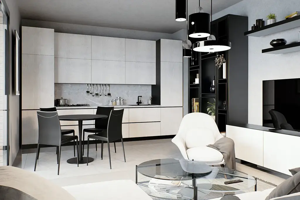 Apartmán S2 o rozloze 84,68 m2 je situovaný v 1. patře budovy. Sestává z chodby, 1 koupelny, WC, 2 ložnic a obývacího pokoje s kuchyní a jídelnou s přístupem na terasu. Byt je orientovaný na jihozápad.