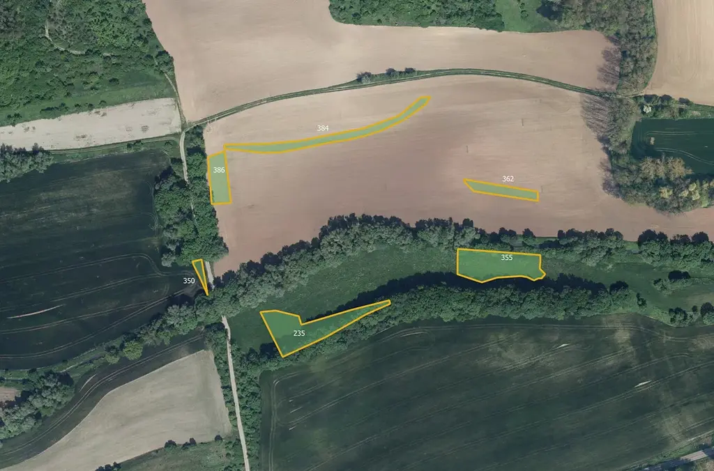 Pozemky jsou vedeny jako orná půda a mají následující čísla: 235, 350, 355, 3562, 384, 386 s 417.