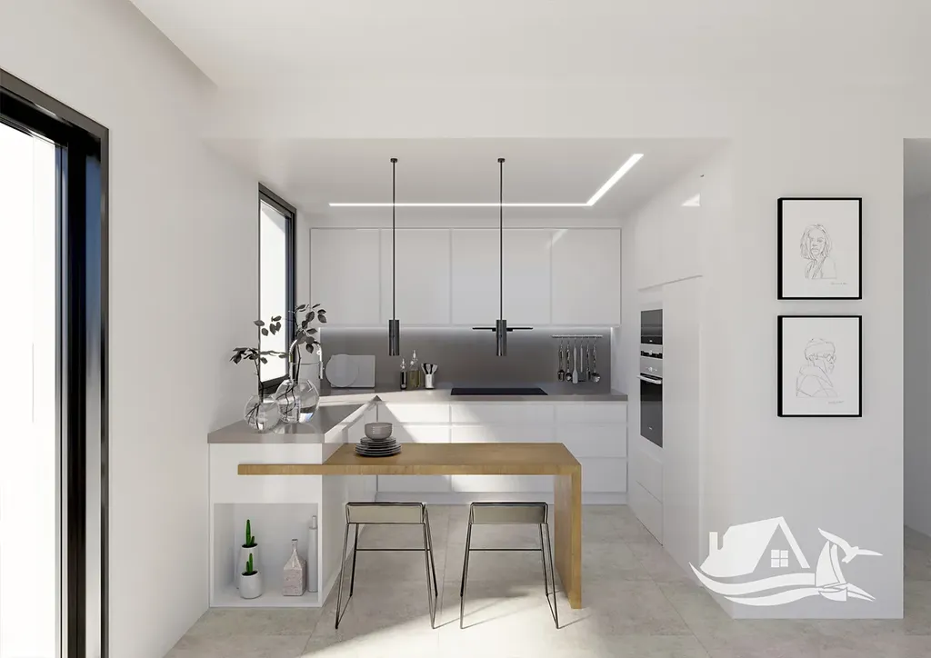 Dominantou bytu je otevřený obývací prostor s kuchyní o velikosti více než 36 m², který působí vzdušně a navazuje přímo na terasu. Kuchyň je plně vybavena moderními spotřebiči a řešena prakticky do tvaru U, což oceníte při každodenním používání. Interiér doplňují vestavěné skříně, kvalitní porcelánové podlahy a bíle lakované interiérové prvky, které drží čistý a nadčasový design.