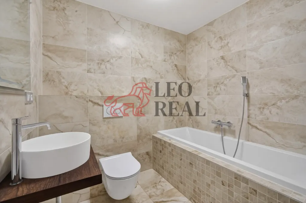 nově obložená koupelna s vanou a nástěnným záchodem se skrytou splachovací nádržkou Geberit;