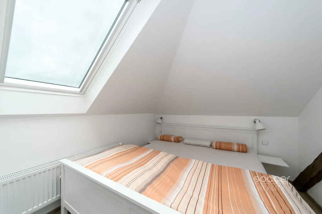 K dispozici zde máte světlý obývací pokoj s atypickým půdorysem, citlivě propojený s promyšlenou kuchyňskou částí, neprůchozí ložnici s vestavěnými skříněmi a jedinečnou podkrovní atmosférou, moderní a prostornou koupelnu se sprchovým koutem a toaletou a chodbu i s komorou.