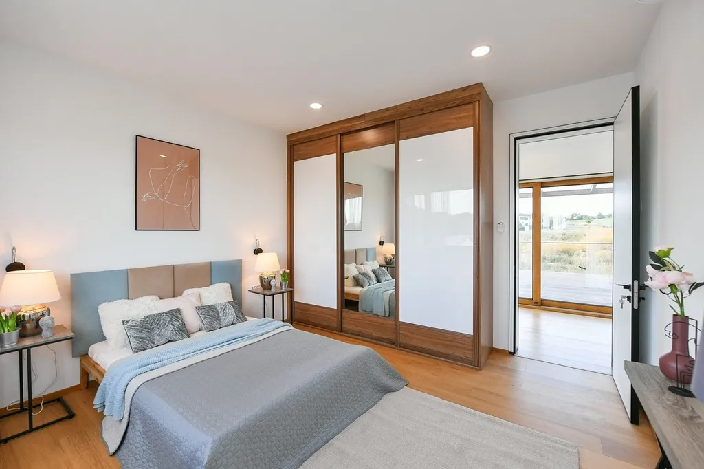 V patře se nachází hlavní ložnice s vlastní koupelnou a šatnou, dvě další ložnice s vestavěnými skříněmi, druhá plně vybavená koupelna a rozlehlá terasa o výměře 70 m² s hliníkovou pergolou – ideální místo pro relaxaci i soukromé chvíle.