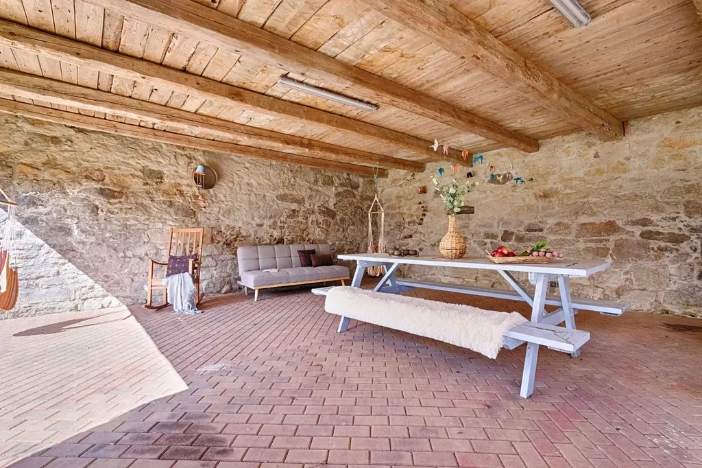 Dvůr uzavírá velká stodola. V její přední části se nachází kryté venkovní posezení ideální pro setkávání s rodinou a přáteli, doplněné o venkovní WC a sprchu. Zadní část stodoly je využívána jako garáž, aktuálně sloužící jako herna. Pod stodolou se nachází menší klenutý sklep.