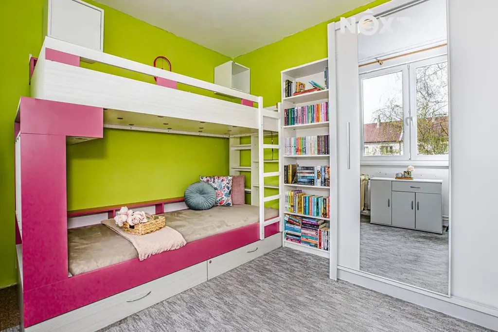 Ložnice (12,3 m²) působí klidně a čistě. Místo, kde se dobře spí a ještě lépe odpočívá. Druhý pokoj (10 m²) dnes funguje jako dětský pokoj, ale stejně dobře může být pracovnou nebo pokojem pro hosty.