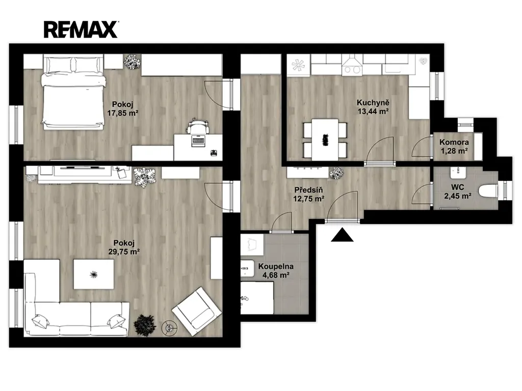 Byt je členěn na kuchyni (cca 13,44m²), pokoj (cca 17,85m²), pokoj (cca 29,75m²), komoru (cca 1,28m²), předsíň (cca 12,75m²), koupelnu s toaletou (cca 4,56m²).