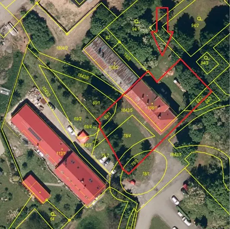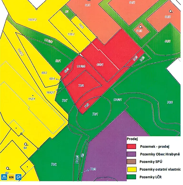 p. č. 69/3 – ostatní plocha o výměře 51 m2, p. č. 78/4 – ostatní plocha o výměře 235 m2, p. č. 78/9 – ostatní plocha o výměře 59 m2, p. č. 84/2 – ostatní plocha o výměře 53 m2 a p. č. 1642/5 - ostatní plocha o výměře 415 m2 v jednom celku společně s pozemkem p. č. st. 108/1 na kterých stojí stavba Hrabyně č. p. 2