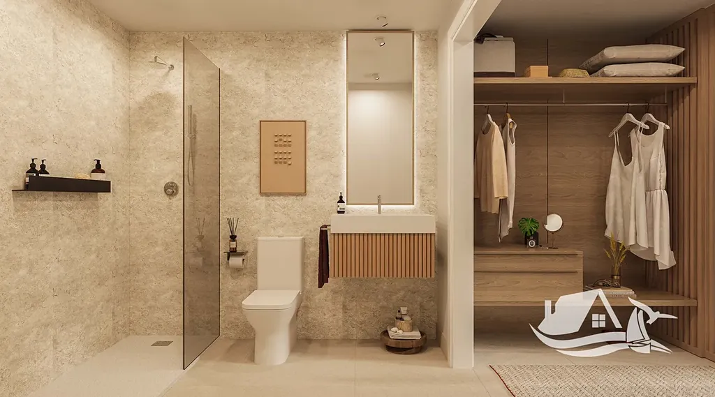 Dispozice se dvěma ložnicemi a dvěma koupelnami je řešena efektivně a prakticky. Užitná plocha přibližně 62 m² je doplněna o venkovní terasy, menší soukromou zahradu a především o solárium o velikosti přes 28 m², které výrazně rozšiřuje obytný prostor. Každý kout má své využití, od ranního klidu na terase po večerní posezení pod otevřeným nebem.