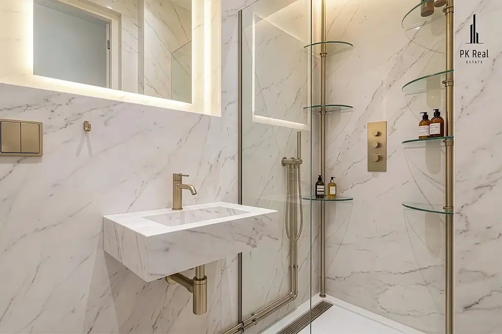 Byt disponuje dvěma koupelnami a samostatným výměnkem, díky čemuž nabízí ideální podmínky pro vícegenerační bydlení, kombinaci vlastního bydlení s podnikáním nebo vytvoření oddělené části pro hosty či dospívající děti.