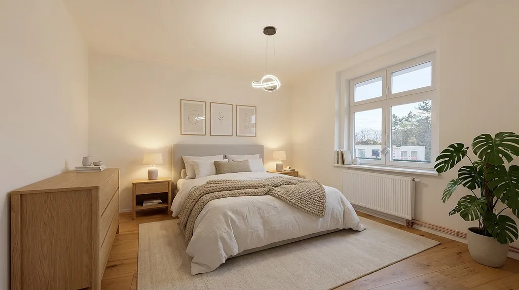 Povrchy: Nové podlahové krytiny v celém bytě a precizní zednické práce (štuky, výmalba).