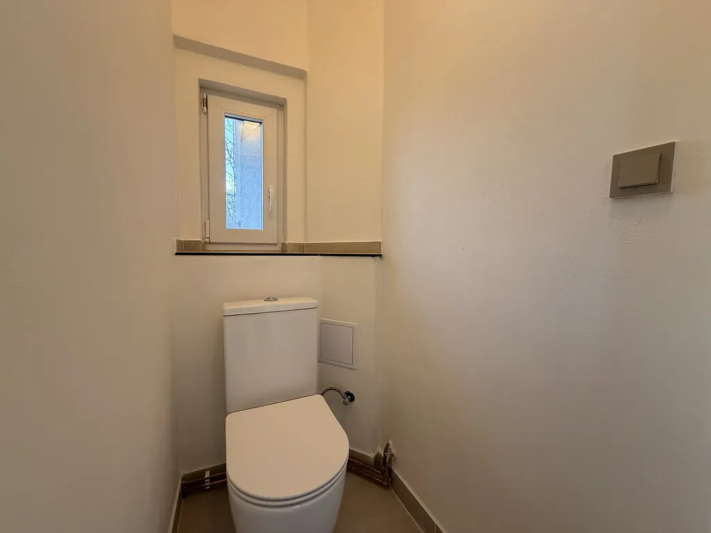 Interiér: Zcela nová moderní koupelna a samostatné WC s použitím kvalitních obkladů a sanity.