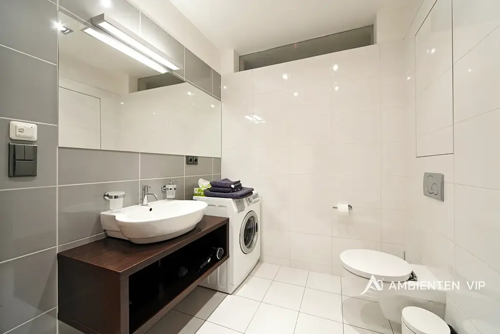 Vybavení bytu: moderní kuchyňská linka na míru s veškerými spotřebiči (varná deska, trouba, digestoř, mikrovlnná trouba, chladnička, myčka nádobí), pračka, vestavěné skříně, postele, obývací stěna, televizor, sedací souprava, konferenční stolek, světla, dřevěné dveře a podlahy, venkovní elektrické žaluzie a klimatizace.