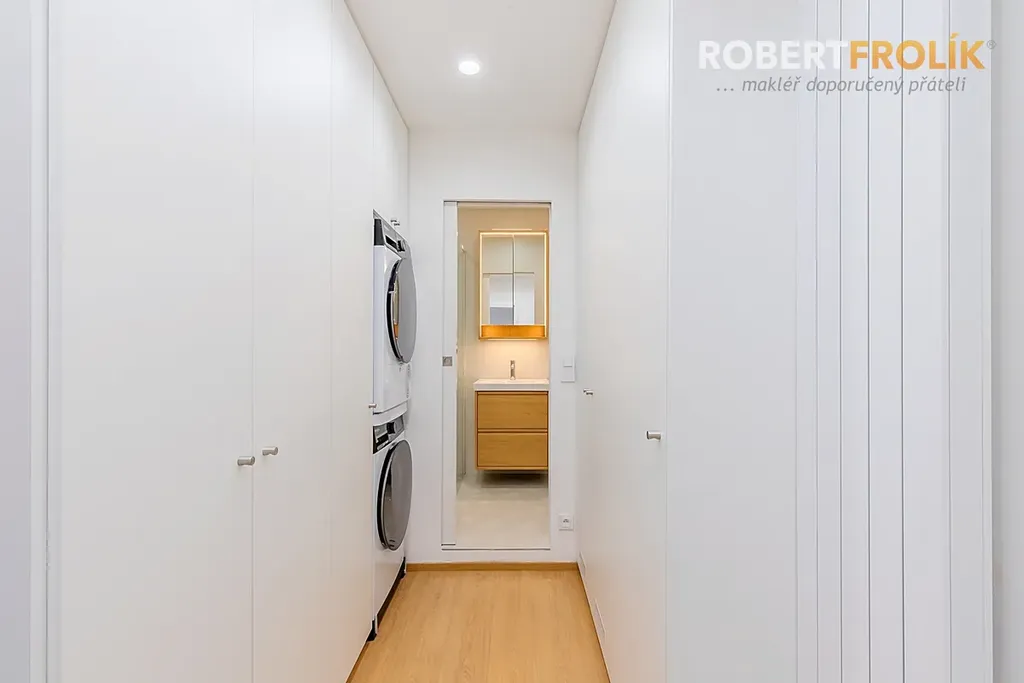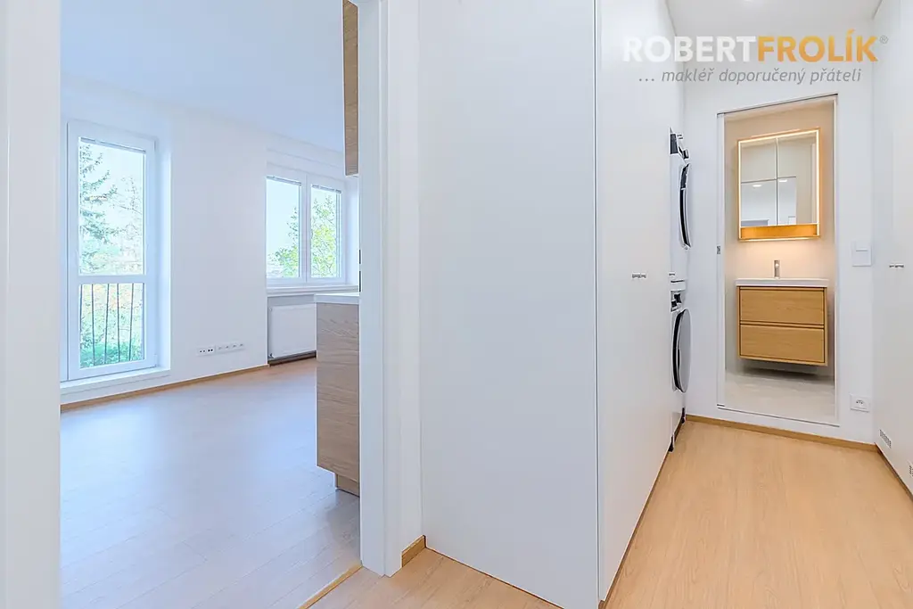 V bytě je využitý každý kousek plochy. Kuchyňský kout v sobě skrývá vestavěné spotřebiče (indukční varná deska, elektrická trouba, digestoř, myčka, lednice s mrazákem). Před kuchyní je místo na malý gauč a TV, u francouzského okna na jídelní stolek, případně i s osvětlením nad ním. V ložnici je šatní skříň ve zdi. Další velké skříně jsou v chodbě. V jedné z nich se skrývá i elektrický bojler na ohřev teplé vody. Topení je v domě centrální, z plynové kotelny v suterénu. Radiátory budete mít i v chodbě a koupelně. Koupelna má okno do velkého světlíku, takže byt se dá krásně větrat. Prádlo si usušíte v sušičce. Vstupní dveře do bytu jsou bezpečnostní, okna plastová s dvojskly a žaluziemi. V suterénu domu budete mít i sklípek a vedle domu pěkné společné posezení.