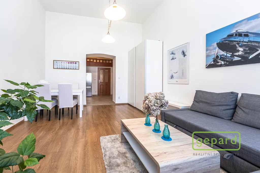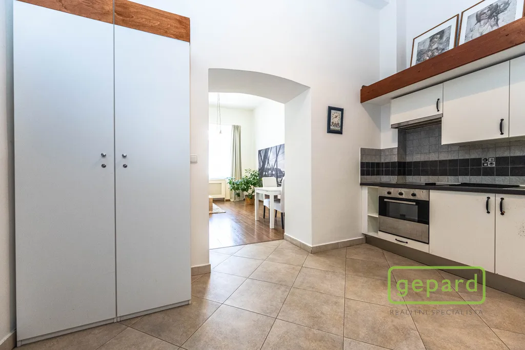 Hlavní obytný prostor je orientován na východ, což zajišťuje příjemné ranní světlo. Byt je stylově zařízený a má vysoké stropy (3,7 m). Obývací část je propojena s kuchyňským koutem. Dále je zde oddělená předsíň a koupelna se sprchovým koutem, umyvadlem, toaletou a pračkou. Velkým benefitem je spací patro umístěné nad částí kuchyně, předsíní a koupelnou, které šetří místo v obytné části, s výškou 1,5 m. Okna do vnitrobloku (z koupelny a nad spacím patrem) umožňují efektivní větrání. Vytápění je zajištěno elektrickými přímotopy a ohřev vody bojlerem.