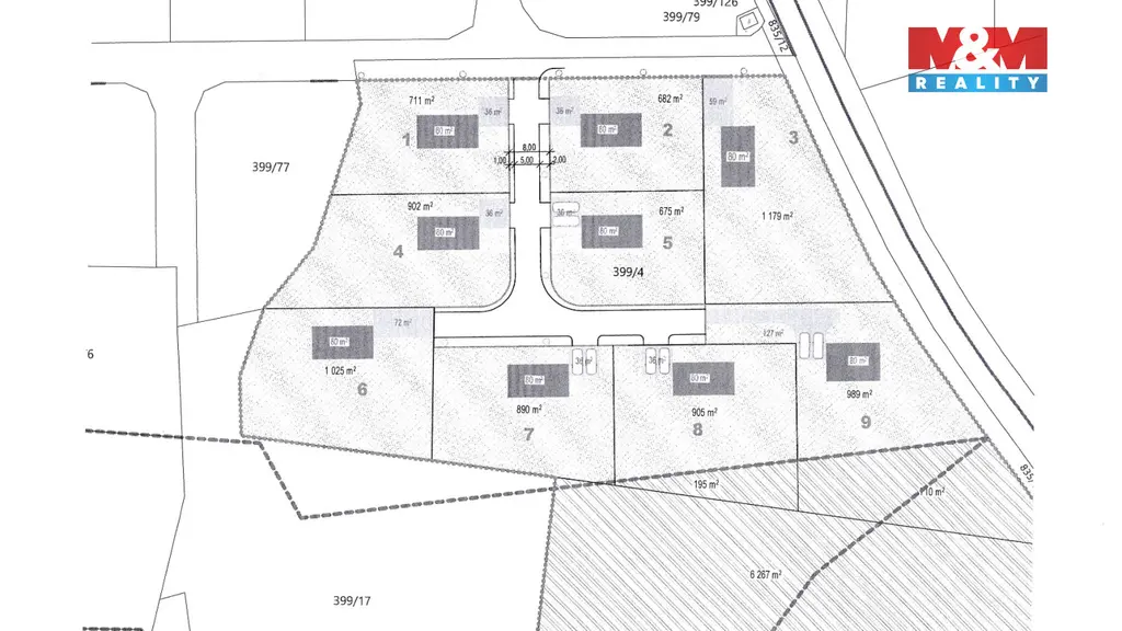 Prodej souboru pozemků o celkové výměře 15 939 m², z nichž 9 675 m² tvoří stavební část dle územního plánu pro nízkopodlažní rezidenční zástavbu — to je příležitost, která se v hranicích Prahy objevuje výjimečně. Lokalita Praha 12 – Točná nabízí klid vilové čtvrti na jižním okraji hlavního města s přímým autobusovým spojením do centra. Infrastruktura je připravena nadstandardně: voda, kanalizace i elektřina jsou přivedeny na pozemek ve dvou přípojkách každá, nová asfaltová komunikace s veřejným osvětlením hotová. Projekt počítá s rozdělením až na 9 samostatných stavebních parcel o výměře 675 až 1 179 m² — ideální základ pro developera, investora i skupinu, která chce stavět společně. Dolní Břežany se vší občanskou vybaveností leží za humny, přírodní rezervace Šance a lesy podél Vltavy přímo za plotem.