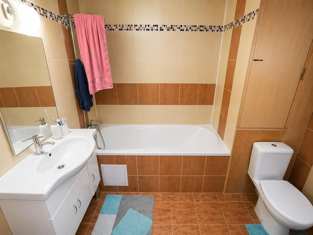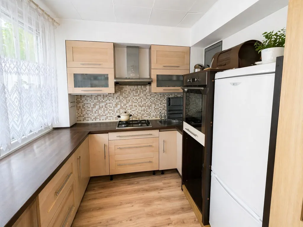 V kuchyni je kuchyňská linka s plynovými kamny. Koupelna je obložena hezkými obklady, vybavena vanou, umyvadlovou skříňkou se zrcadlem a WC.