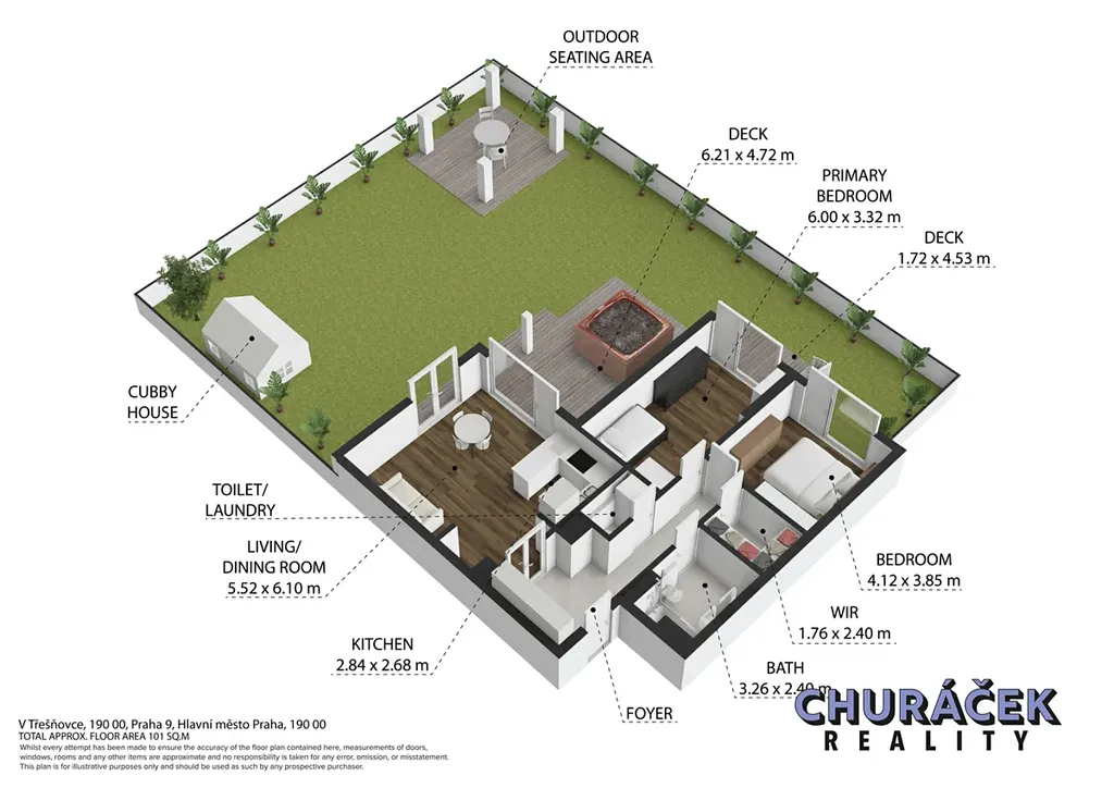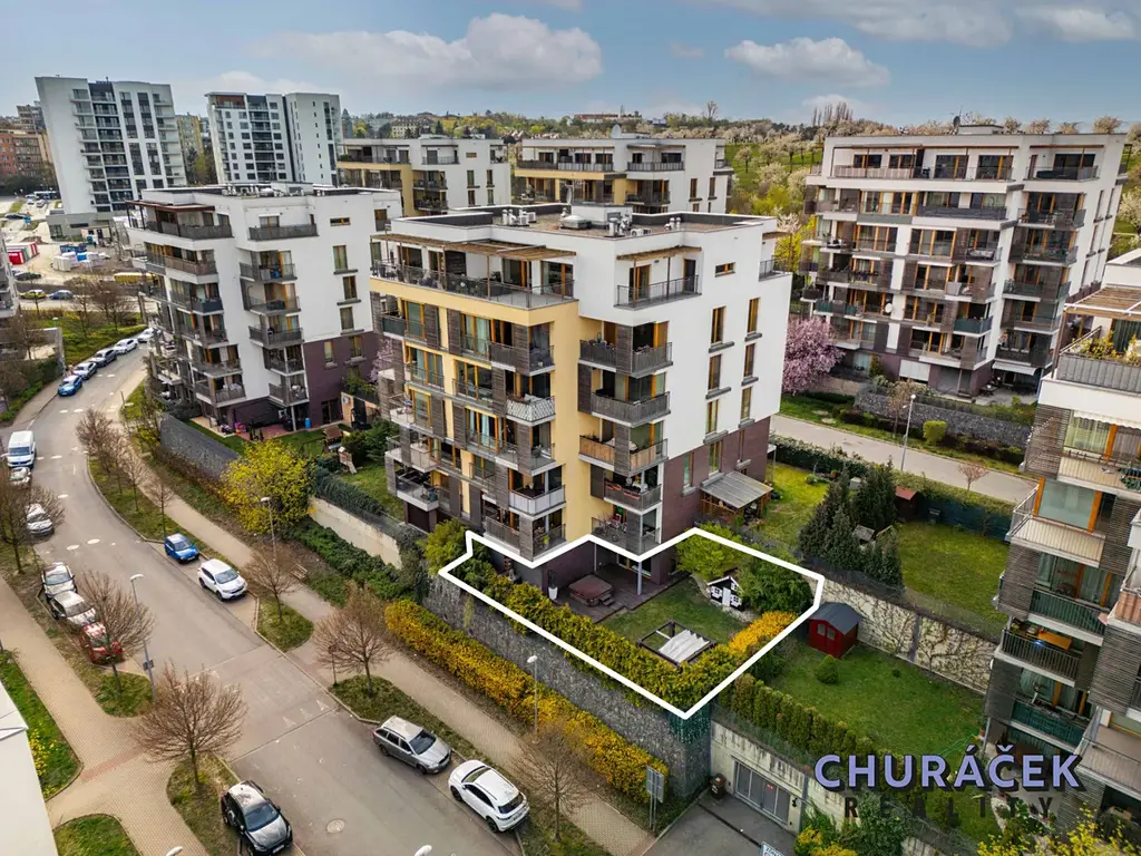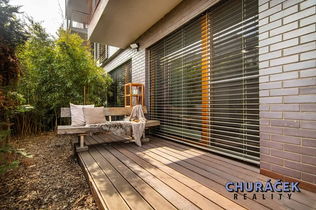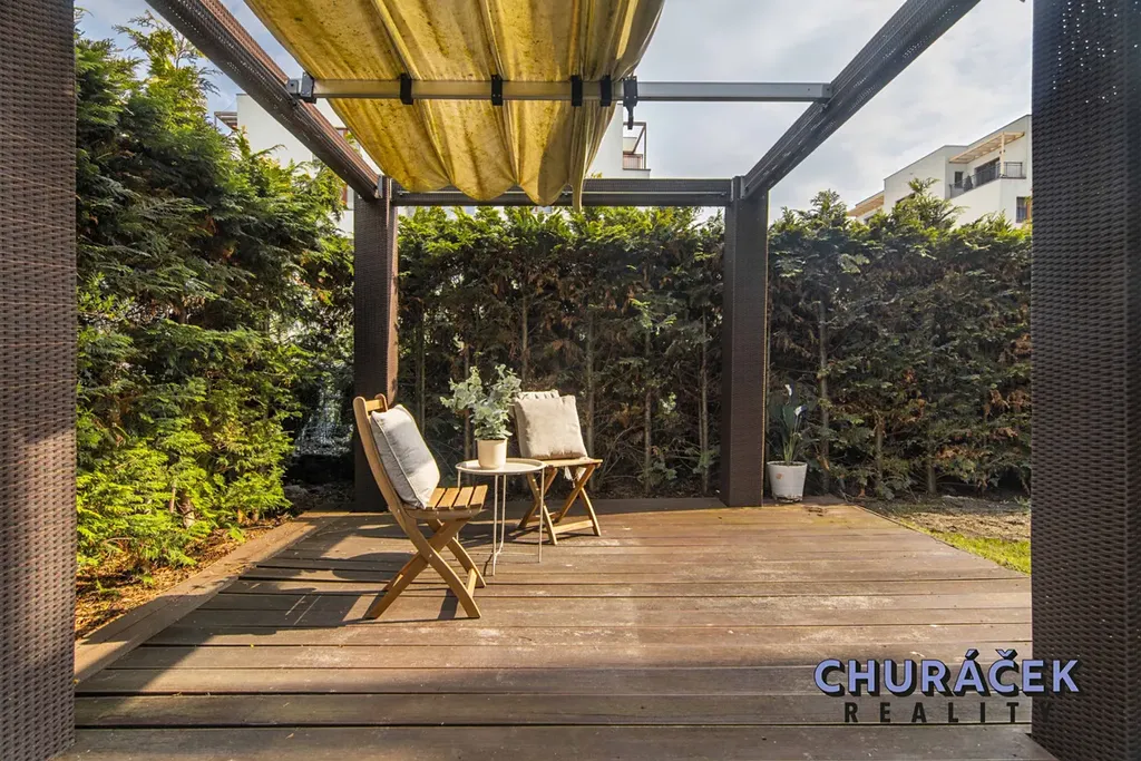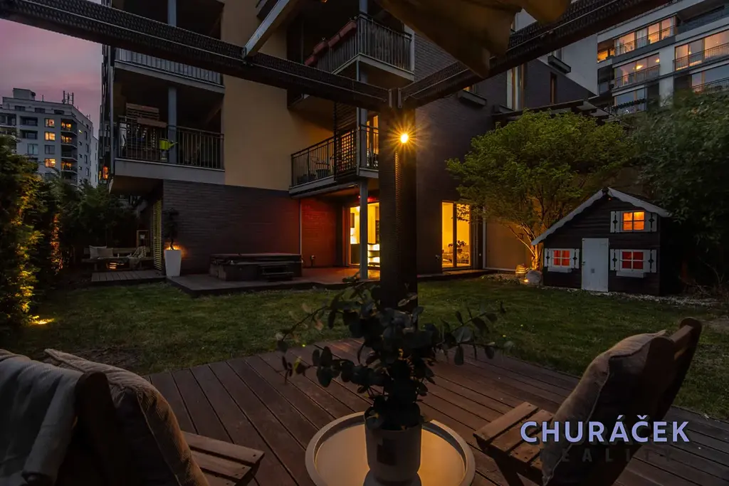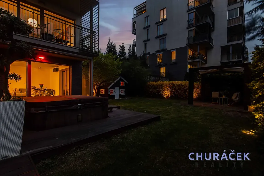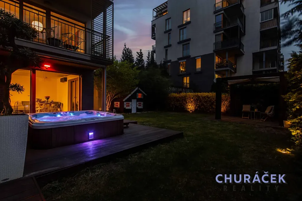 Byt má celkovou podlahovou plochu téměř 100 m² a je doplněn o soukromou předzahrádku o velikosti přibližně 200 m². Ta nabízí skutečný pocit soukromí, jelikož je situována ve vyvýšené části cca 4 metry nad okolním terénem. Zahrada je vybavena altánem, dětským domečkem, prostornou vířivkou a dále prvky zvyšujícími komfort užívání, jako je elektricky ovládaná pergola, venkovní osvětlení, stínění či sítě proti hmyzu.