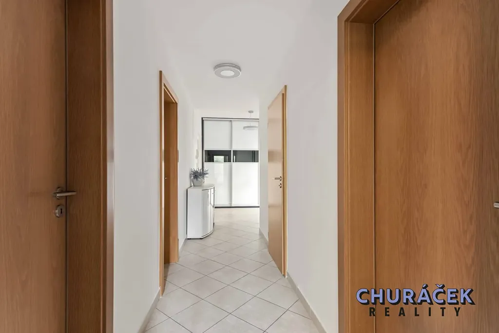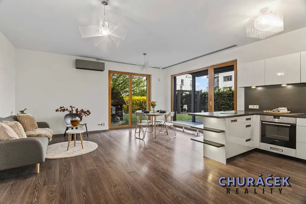 Dispozičně byt nabízí prostornou vstupní předsíň s dostatkem úložných prostor, světlý obývací pokoj s klimatizací a plně vybaveným kuchyňským koutem se vstupem na zahradu, dvě samostatné ložnice, velkorysou koupelnu, samostatné WC a praktickou úklidovou místnost, která může sloužit také jako šatna.