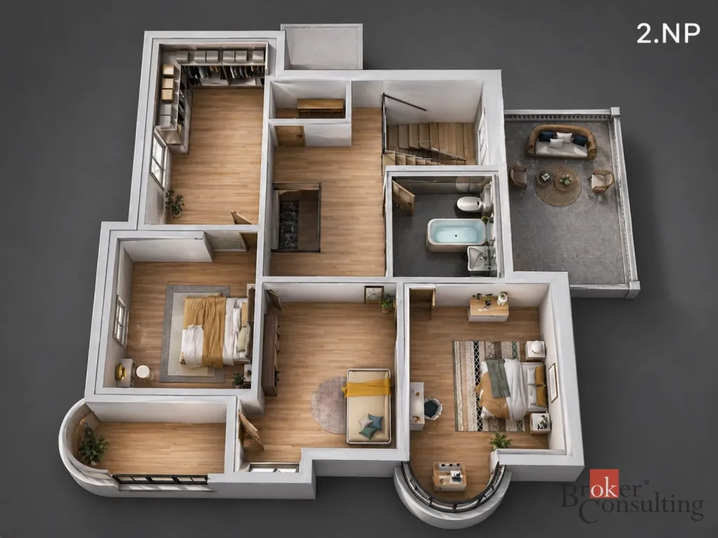 Dispozice domu je velmi velkorysá a rozložená do tří podlaží. V suterénu se nachází několik sklepních místností a technické zázemí o celkové ploše přes 75 m², což nabízí široké možnosti využití pro skladování, hobby zázemí, dílnu, domácí fitness nebo další doplňkové prostory. Hlavní obytné podlaží tvoří vstup, prostorná hala, koupelna se sprchovým koutem a toaletou, dva pokoje, kuchyň, spíž, schodiště a zimní zahrada, která dodává domu mimořádně příjemnou atmosféru. V patře se nachází další hala, koupelna s vanou, samostatné WC, ložnice, dva další pokoje, šatna a komora. Dům tak nabízí dostatek prostoru pro větší rodinu, vícegenerační bydlení i kombinaci bydlení a práce z domova.