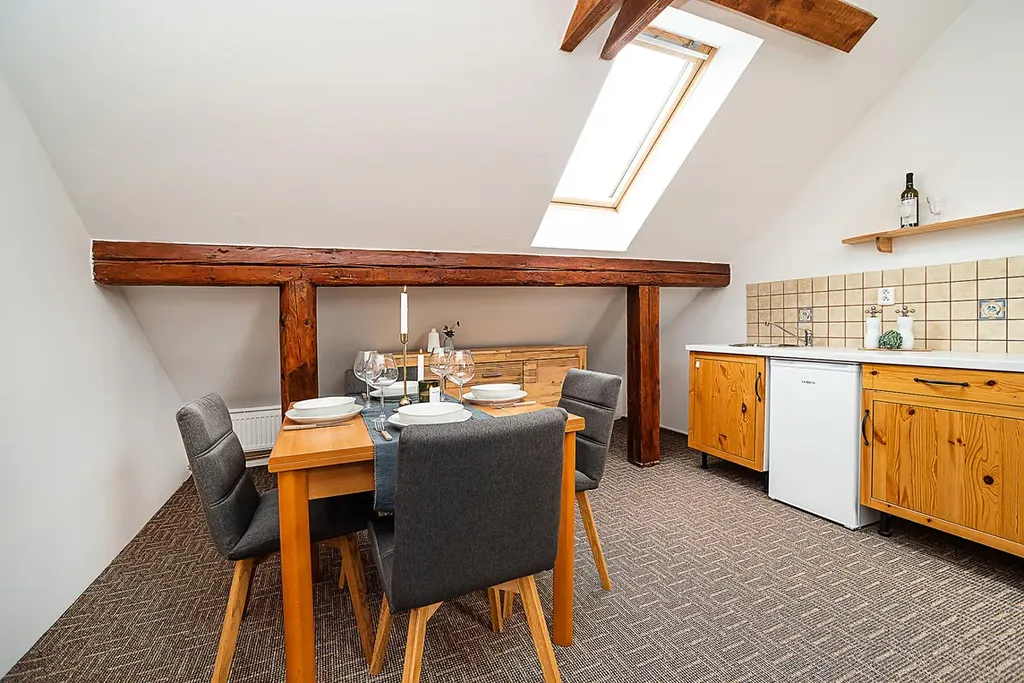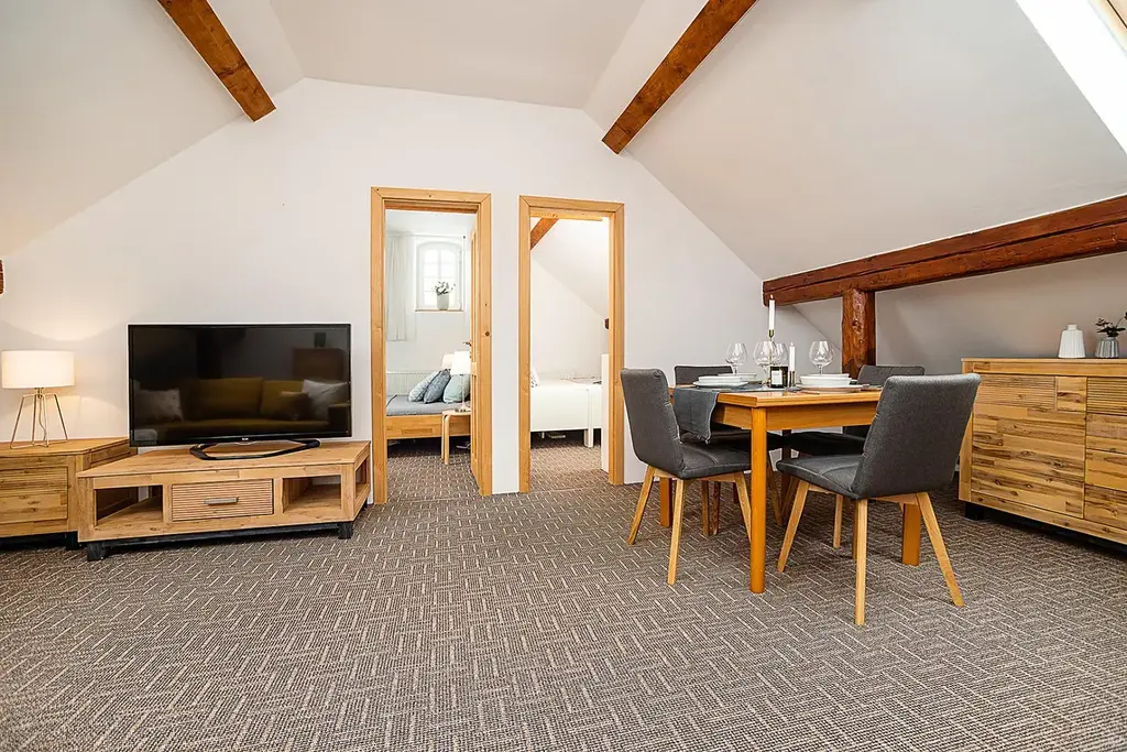 Apartmán se nachází ve 3. NP a nabízí velkorysých 76 m² podlahové plochy (užitná plocha 58 m²). Díky šikminám působí interiér velmi útulně a horsky.