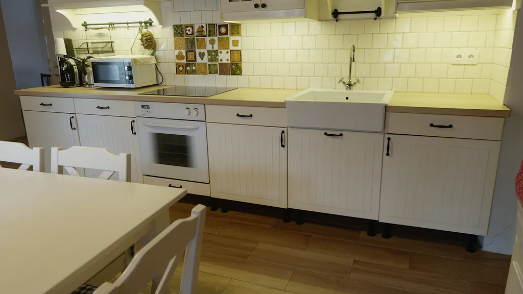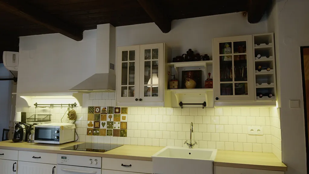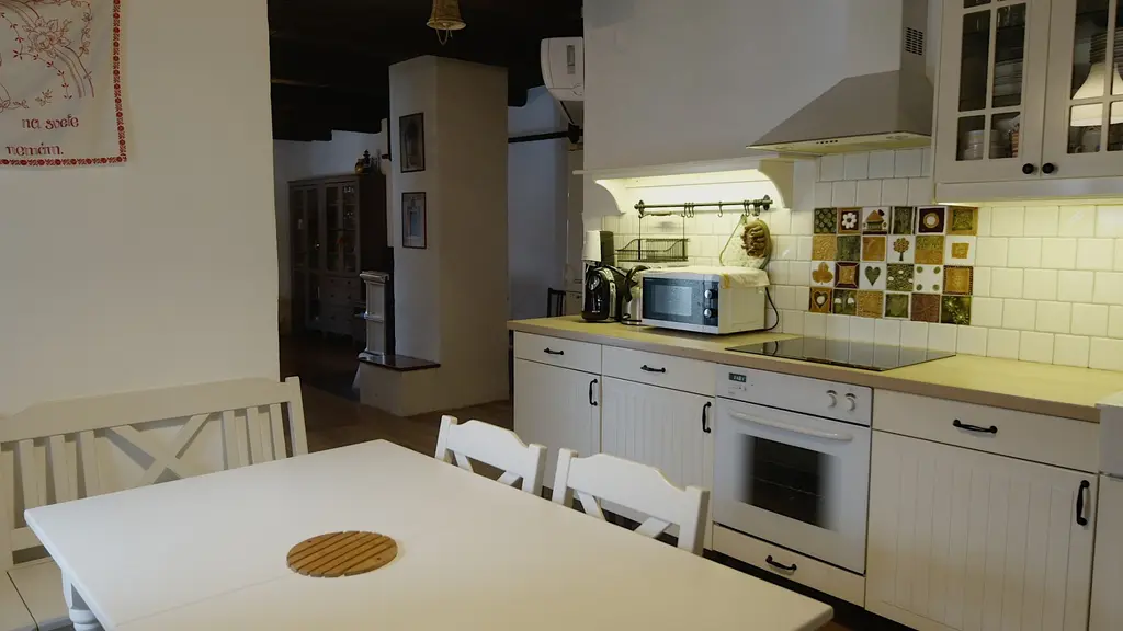 Horní obytná část prošla přenou rekonstrukcí, jejíž součástí je modernizace části elektroinstalace včetně instalace elektrického podlahového vytápění v koupelně, výměna některých oken a instalace bojleru na ohřev vody. Dále byla v rámci rekonstrukce provedena renovace koupelny (topení, odpady, rozvody vody a dlažby s obklady), výměna podlahy v kuchyňské části a vybudování teras. Vytápění je řešeno kombinací elektrických přímotopů, výkonné klimatizace s funkcí vytápění (výkon topení 7,2 kW, možnost ovládat aplikaci v mobilním zařízení) a kamen na tuhá paliva. Díky tomu je možné flexibilně regulovat náklady na provoz i tepelný komfort. Interiér je vybaven kuchyňskou linkou včetně vestavné horkovzdušné trouby, sklokeramické varné desky a digestoře. Součástí je také sada skříní, pohovka a bílá sedací souprava s jídelním stolem z masivu (truhlářská výroba, pořizovací cena cca 40.000,- Kč). Interiérové trámy a stropní desky byly před 2-3 lety zachovány proti škůdcům. Nemovitost je připojena na obecní vodovod a elektrickou síť. Odpad je sveden do skruží s trativodem, který je dlouhodobě bezproblémově využíván (cca 13 let).