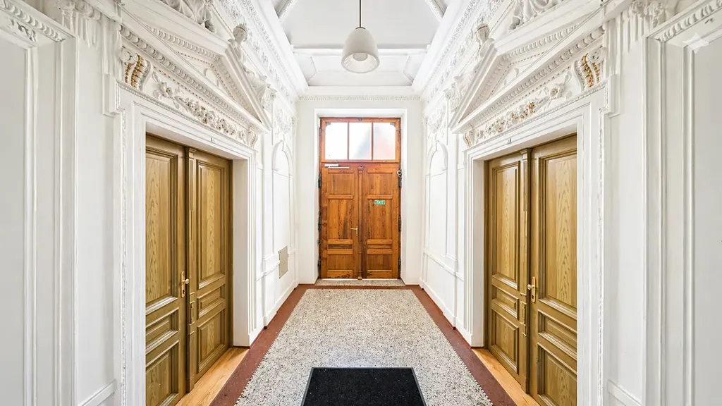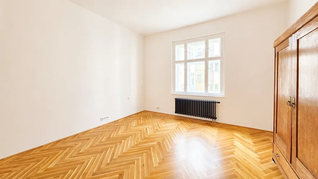 Byt nabízí ideální kombinaci historického kouzla a moderního komfortu. Dominantou je designová kuchyňská linka na míru s kompletně vestavěnými spotřebiči (indukční varná deska, horkovzdušná trouba, lednice s mrazákem, myčka nádobí), která splňuje požadavky i náročného klienta. Podlahy tvoří kvalitní dřevěné parkety v kombinaci s velkoformátovou dlažbou, které podtrhují nadčasový charakter bytu.