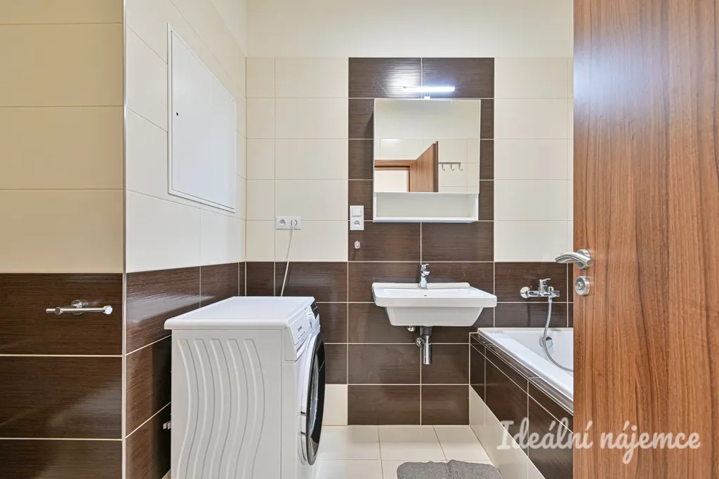 V koupelně se nachází vana, umyvadlo s úložnou skříňkou, zrcadlo, toaleta a pračka.‍