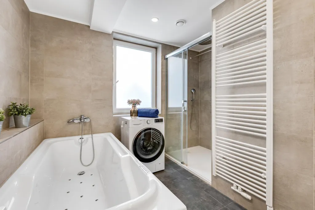 V přízemí se nachází moderně a kompletně zrekonstruovaná bytová jednotka o dispozici 3+kk s výměrou cca 90 m2, jejíž dominantou je obývací část s kuchyní a jídelním koutem o velikosti téměř 40 m2. V celém interiéru najdete kvalitní materiály, včetně dřevěných podlah. Samozřejmostí je samostatná koupelna s vanou i sprchovým koutem, oddělené WC, praktická komora a dva další prostorné pokoje. A bonusem je přímý vstup na prostornou terasu, a to jak z ložnice, tak z obývací části.
