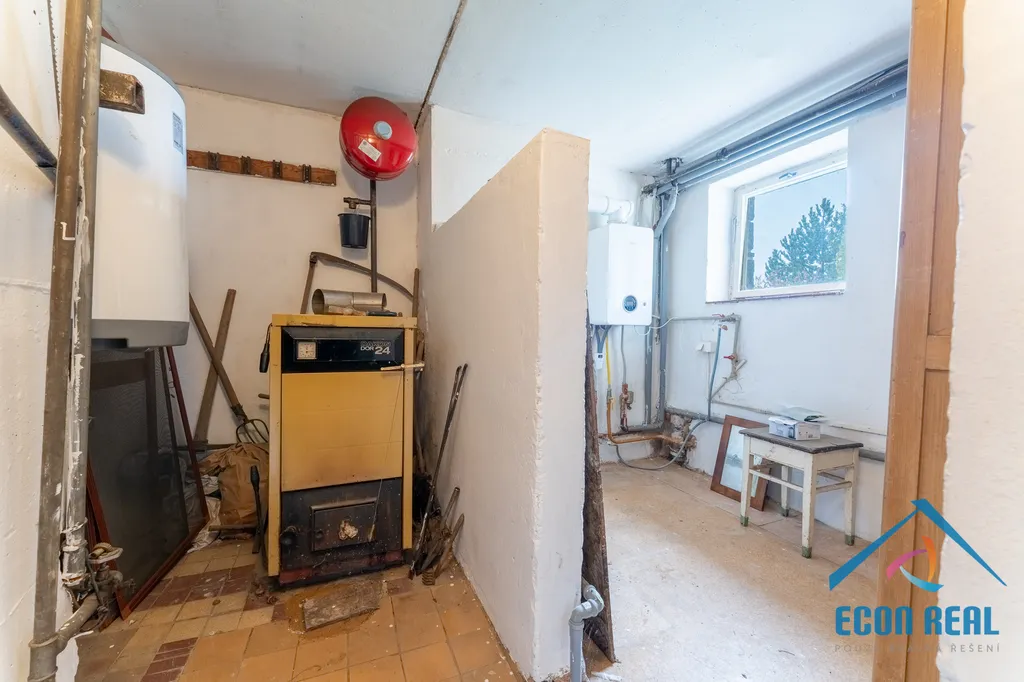 V nižším podlaží najdete skladové prostory, potravinový sklep, prádelnu, potenciální hernu s akumulačními kamny a kotelnu s funkčním kotlem na tuhá paliva, bojlerem na ohřev vody a moderním, nízkoenergetickým plynovým kotlem BOSH (v podstatě nový).