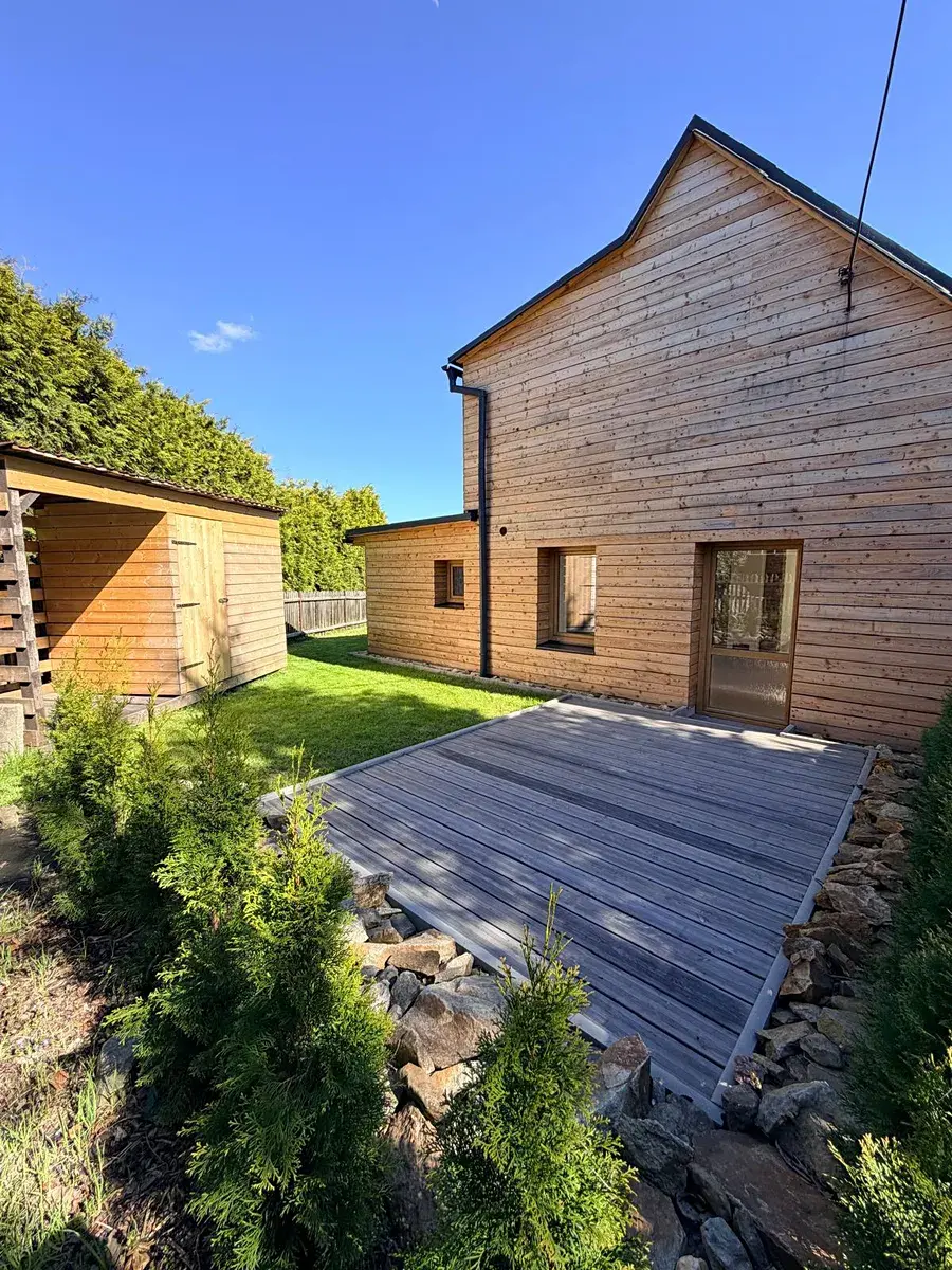 I exteriér domu dostal nový kabát. Zejména kompletní zateplení domu v kombinaci polystyrénu a vaty ve starší části domu a následné modřínové obložení, které dodává domu velmi moderní vzhled. Proti vlhkosti byla zhotovena drenáž kolem domu plus nopová fólie. Zahrada o celkové výměře 216 m2 dostala ze tří stran nový dřevěný plot. Dále zde najdeme nově vzniklou terasu s terasovými prkny, dřevník a kůlnu na uskladnění zahradního náčiní.